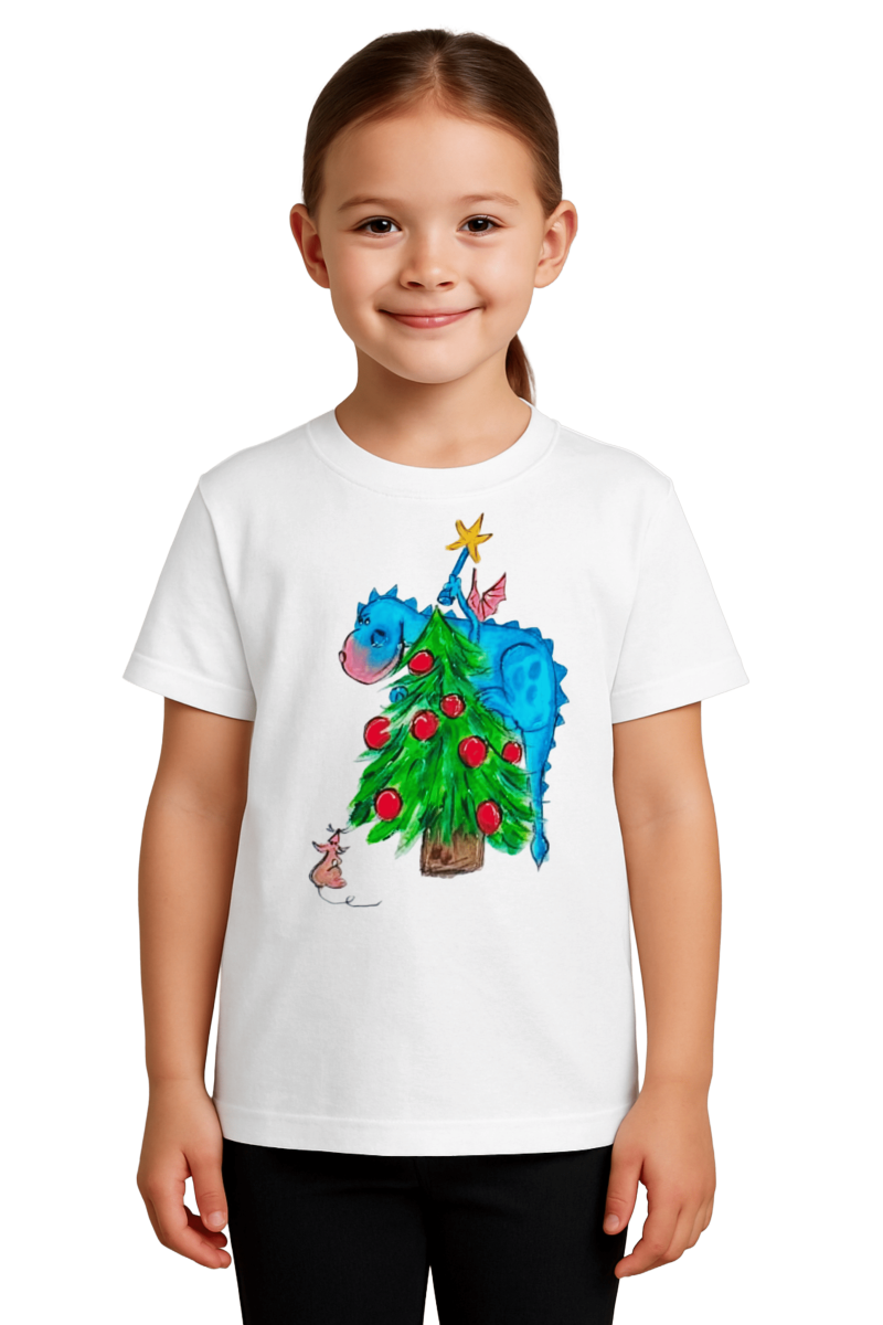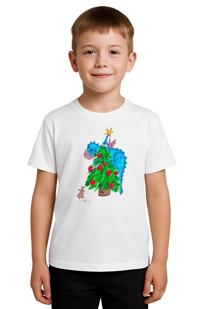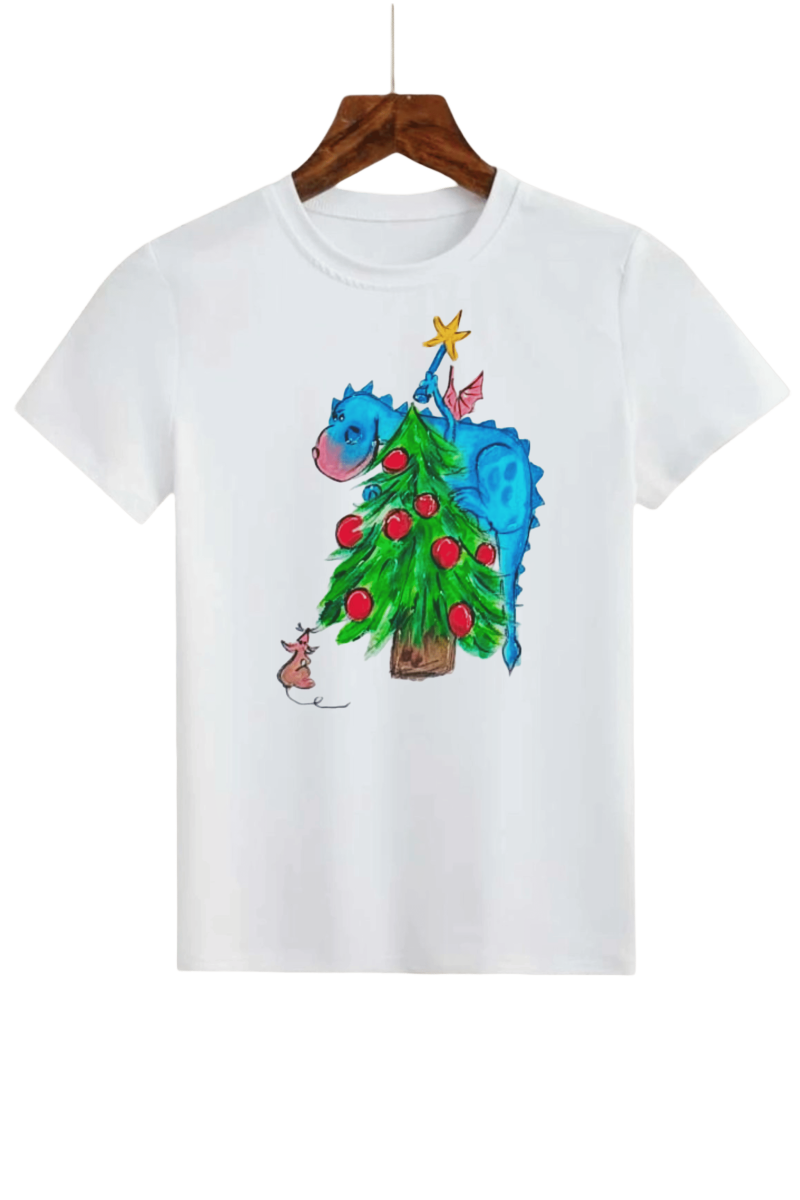 Tricou Crăciun Dragonul și Bradul Fermecat este o alegere veselă și plină de culoare pentru cei mici în perioada sărbătorilor. Designul pictat manual aduce la viață un dragon simpatic care împodobește bradul, alături de un șoricel curios. Este un tricou care transformă Crăciunul într-o poveste purtată.