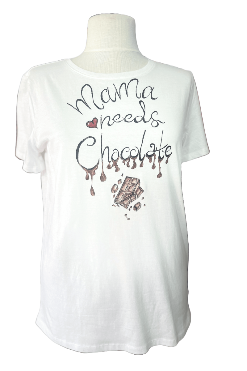 Răsfață-te sau surprinde pe cineva drag cu acest tricou pictat manual Mama iubește ciocolata – pentru mamele care știu că o pătrățică de ciocolată face minuni.