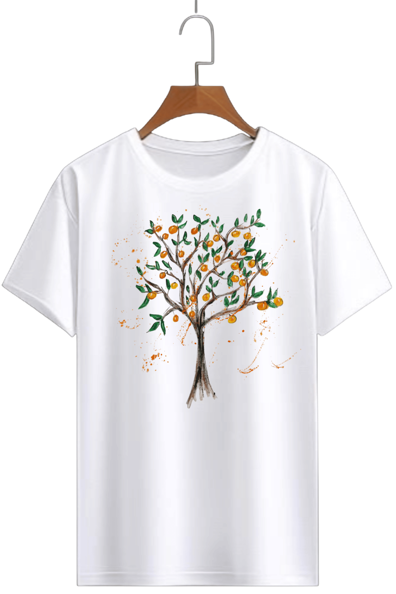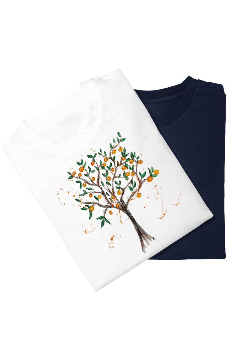 Alege un tricou pictat manual Pomul cu portocale și lasă natura să te inspire, purtând o poveste pictată cu drag.