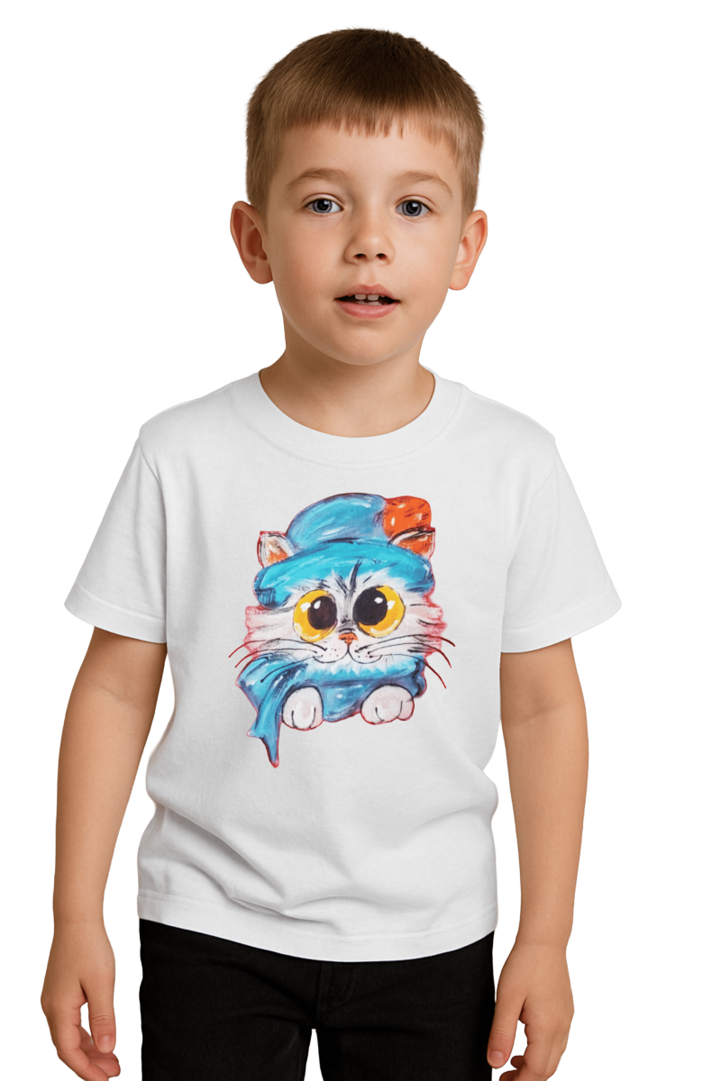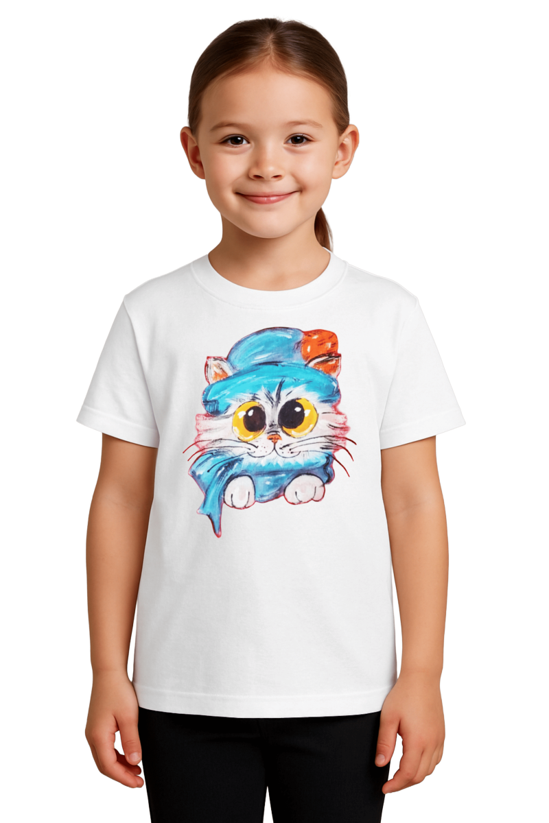 Tricou pictat Pisicuța de Iarnă este alegerea perfectă pentru copiii care iubesc iarna și personajele simpatice. Designul colorat, realizat manual, redă o pisicuță cu ochi mari și blânzi, îmbrăcată cu căciulă și fular albastru. Un tricou care aduce zâmbetul pe buze încă de la prima privire.